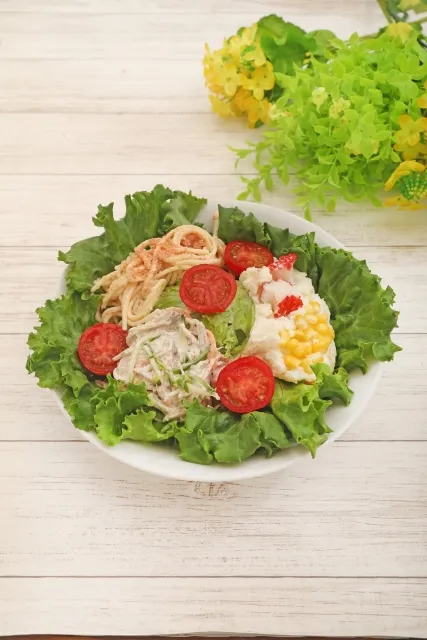 4)放射状に8等分に切ったハムとマヨネーズを袋の中に入れてなじませ、塩こしょうで味を整えれば完成です